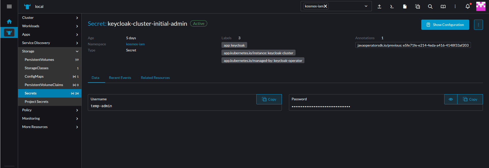 • Click on the keycloak-cluster-initial-admin field